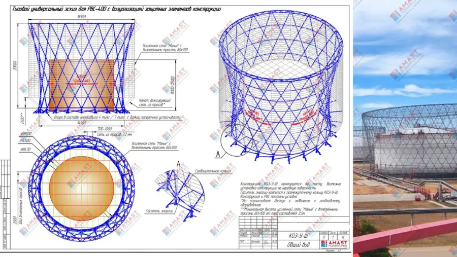 Обратим внимание: конструкции КОЗ-У-Ш предназначены для защиты резервуаров, подстанций и нефтегазового оборудования от беспилотников самолётного типа массой до 200 кг, летящих со скоростью до 200 км/ч. Система реализует жертвенную концепцию охраны объектов: каркас, тросы и стека принимают удар БПЛА, сохраняя целостность самого резервуара или оборудования без прогрессирующего разрушения защитной системы.