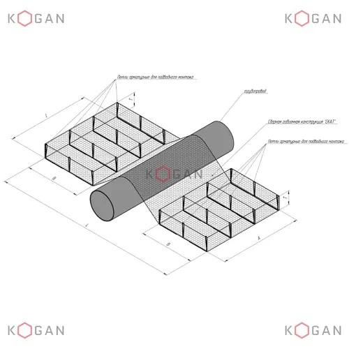 Габионы для подводной укладки представляют собой комплект габионного изделия и закладной детали, служат для формирования заполненного камнем габиона, с последующим его погружением в воду на дно с помощью специальной траверсы.