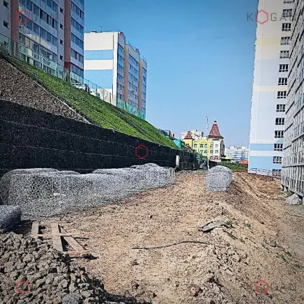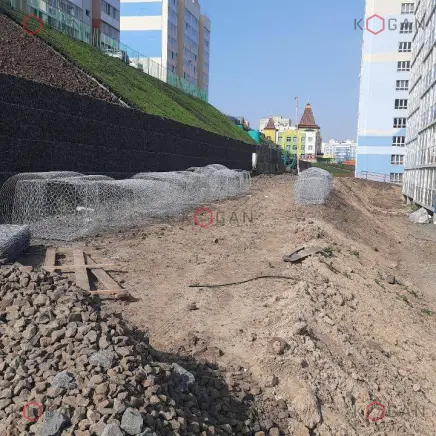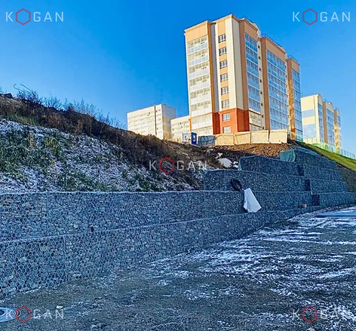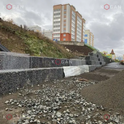 Высота стены составила 8 метров. Конструкция не только обеспечила безопасность и устойчивость склона, но и продемонстрировала, как современные габионные технологии позволяют решать сложные градостроительные задачи, создавая при этом основательные и эстетичные архитектурные формы.