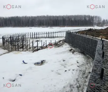 Для монтажа берегоукрепления применены матрацно-тюфячные габионы, изготовленные на нашем заводе. Их мы отправили на стройку вместе с вязальной проволокой в необходимом заказчику количестве. Всего для объекта изготовили 201 габионную конструкцию общим весом около 8 тонн.