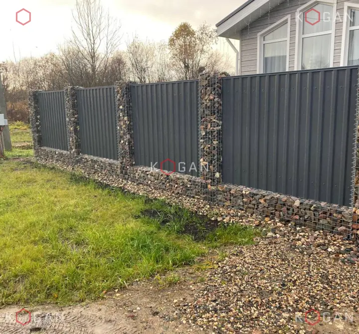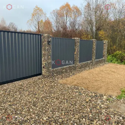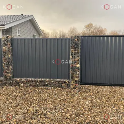 Пространство между столбами заполнено профнастилом глубокого графитового цвета. Оттенок выбран не случайно. Он не кричащий, не «синтетический», а благородный, матовый. Идеально подошёл к палитре габионов и камня, создав приятный контраст по фактуре.