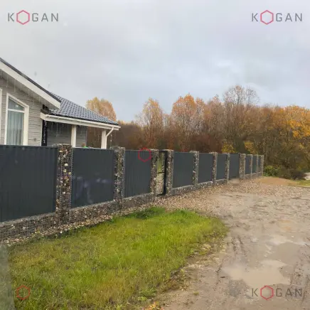 Материалом для создания габионной части забора послужила сварная сетка с ячейкой 50×100 мм (для столбов) и 50×50 мм (для цоколя). Диаметр оцинкованной проволоки сетки — 4 мм. Такому материалу не страшны суровые погодные испытания, конструкция сохраняет жёсткость и геометрическую чёткость. Монтаж габионов выполнен с помощью спиральных соединений. Высота забора — 2 м 30 см.