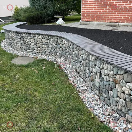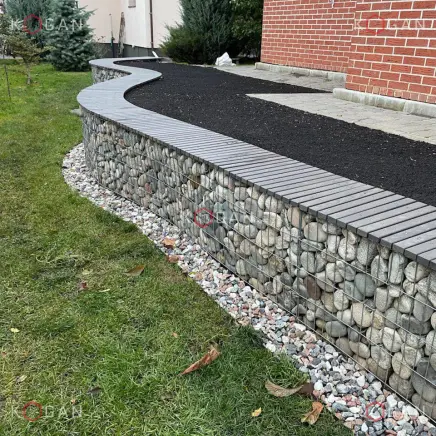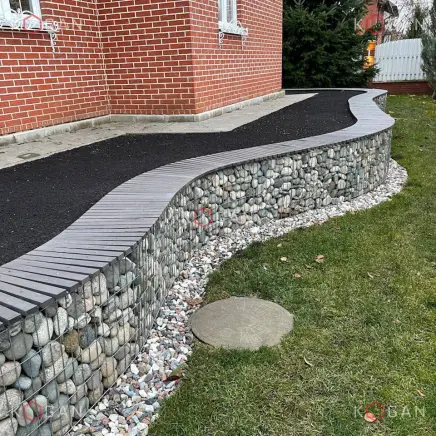 Желание заказчика террасировать участок и эстетично оформить пространство возле дома воплотилось в изящном проекте с применением наших сварных габионов. Именно из них возведена подпорная стенка с нестандартной геометрией — она не прямая, изгибается мягкими волнами. Решение стало возможным благодаря особенностям оцинкованной сварной сетки, сочетающей конструкционную жёсткость с гибкостью и позволяющей воплощать сложные дизайнерские замыслы без ущерба для надёжности построек.