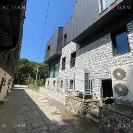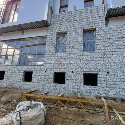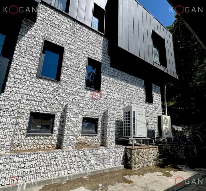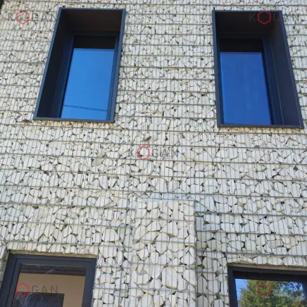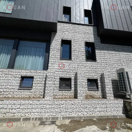 Габионная облицовка закрывает первый и второй этажи. Наполнены габионы белым камнем, что создаёт благородный, неутяжелённый облик объекта. Конструкции при этом аккуратно обходят оконные проёмы с минималистичными чёрными наличниками, окна смотрятся эффектно и контрастно в каменном обрамлении.