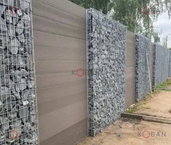 Для сборки низкого парапета заказчику понадобилось всего три сварных габиона с размерами 2×0,3×0,65 и 2,2×0,3×0,65 метра. Размеры ячеек сетки 50×50 мм. Конструкцию собрали буквально за несколько часов, пользуясь спиральными соединениями, а наполнили серой галькой, которая выглядит лаконично и стильно. Благодаря оцинковке и достаточной толщине (4 мм) проволока сетки габионов выдержит любые погодные испытания и смену сезонов на протяжении долгих лет.