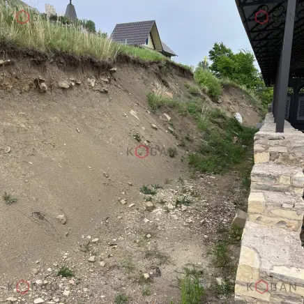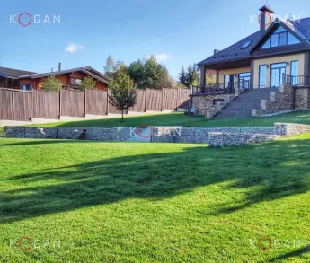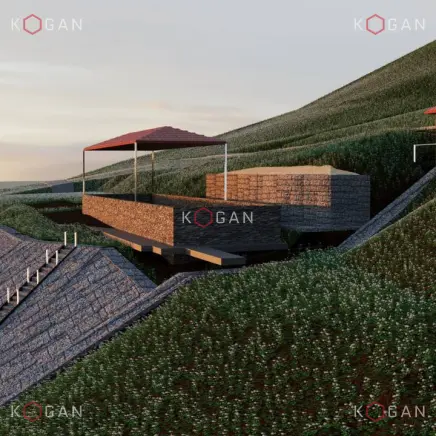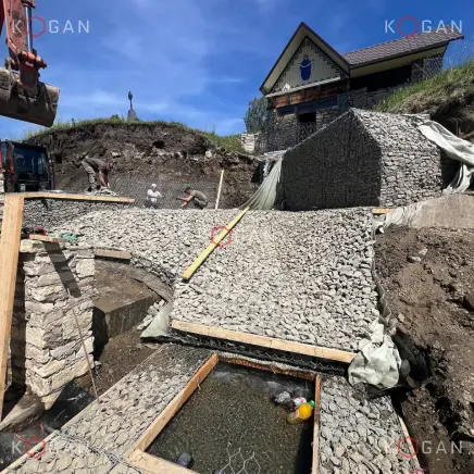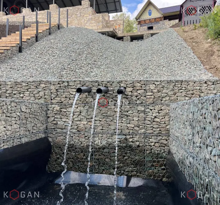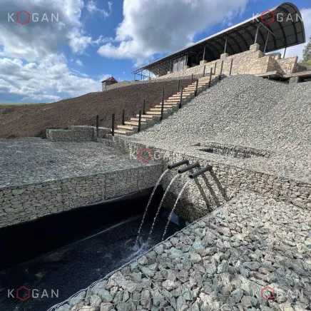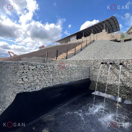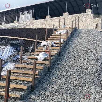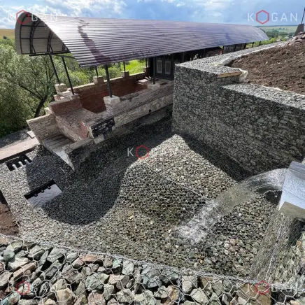 Ниже по склону, от павильона до самой низины, укладывали геоматы, укрепили откос матрацно-тюфячными габионами, в основании установили упорный зуб. Каменный материал в габионные конструкции укладывали профессионально (о чём свидетельствует и эталонный внешний вид кладки), вручную, точно следуя проекту, делали выступы, выемки, ниши. Также смонтировали длинную габионную лестницу с закладными деталями, ведущую с террасы в низину.