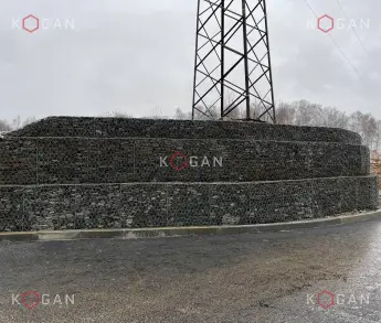 Работы проведены в 2020 году. Поставку габионов на объект выполнил наш завод. Строители установили шпунтовое ограждение. Используя коробчатые габионы и геомешки, возвели ступенчатые подпорные стенки.