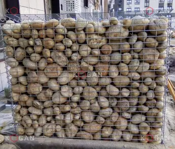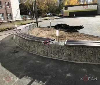 Сварные габионы строители приобрели на нашем заводе. Установили клумбу прямоугольной формы, наполнили натуральным щебнем. С двух сторон на габионы уложены доски – клумба служит ещё и скамейкой.