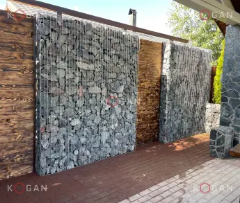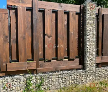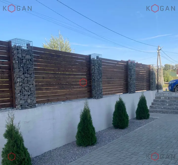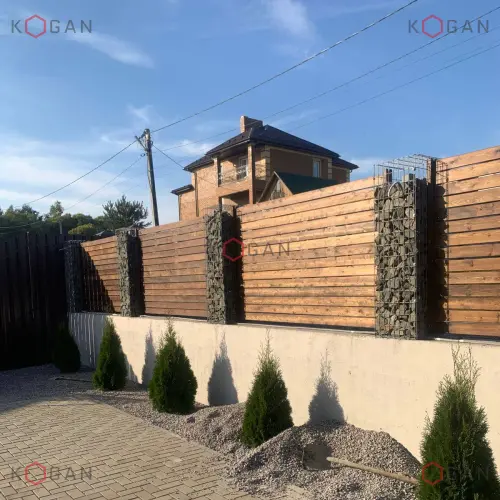 Решение простое и эффективное: на предварительно подготовленное высокое бетонное основание установлены габионные столбики, заполненные природным камнем. Сборка габионов выполнялась с помощью болтовых креплений. Пространство между столбами заполнено деревянными досками, что создаёт гармоничный контраст фактур — брутальность каменного наполнителя оттенена тёплым оттенком натурального дерева.