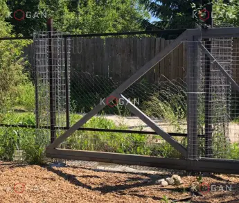Для монтажа габионных секций забора понадобилось девять сварных габионов. Их мы изготовили из панелей с ячейкой 50×100 мм. Материал панелей – стальная оцинкованная проволока диаметром 3,8 мм. Бригада заказчика устанавливала габионы на опорные столбы. Монтажные спирали и стяжки мы предоставили в комплекте.