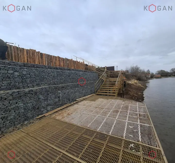 Результат работ — стабилизированный берег, готовый выдерживать сезонные паводки и течения, и комфортный доступ к воде для жителей посёлка. Лиственница — единственная порода дерева, которая не просто не боится влаги, но при контакте с ней, наоборот, набирает прочность. Габионы же не только укрепляют береговую линию, но и служат дренажом благодаря своей водопропускной способности. Сочетание габионов и лиственницы эстетически приятно и органично дополняет речной ландшафт.