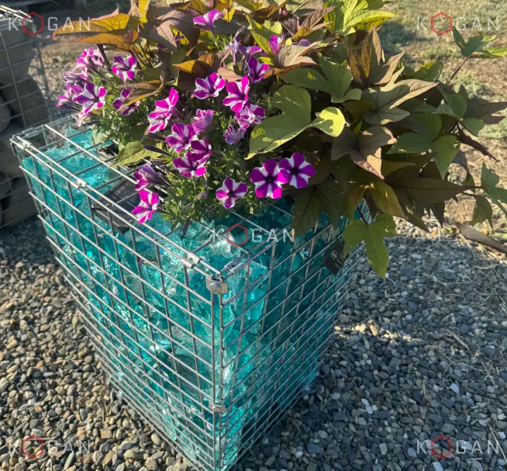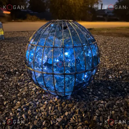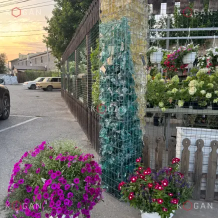 Для наполнения габионов астраханские мастера используют натуральный камень разных фактур и цветов. Самые популярные варианты — благородный булыжник, колотый и галтованный гранит. Однако особой выразительностью малые архитектурные формы наделяет эрклёз, и здесь тоже «глаза разбегаются» от количества оттенков: лазурно-бирюзовое стекло, оранжевое, янтарное, жёлтое, изумрудное... Учитывая разнообразие форм, фракций, степеней прозрачности эрклёза и вариативность характеристик подсветки, дизайнерский потенциал садовых и уличных габионов приближается к бесконечности!