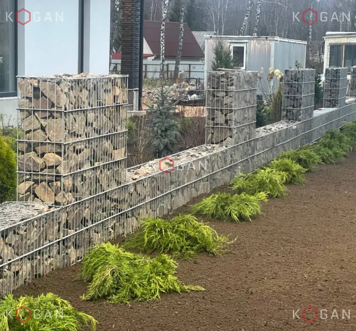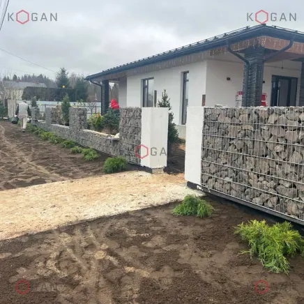 На одном из частных участков Солнечногорска появился аккуратный габионный заборчик. Конструкция невысокая, наполнена серым крупноформатным камнем. При этом она не выглядит тяжёлой или громоздкой — деликатно обозначает границу участка, оставаясь визуально лёгкой и приветливой.