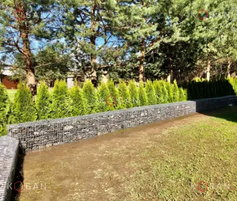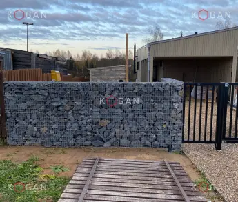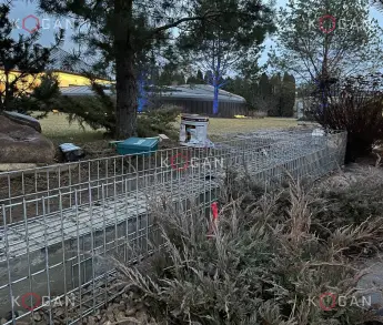 Размеры мангального уголка составляют 1,5×1 м, высота 2 м, поэтому для создания габионной облицовки хватило сварных карты. Для создания стенок шириной 10 см мужчина использовал ещё две сварных «полосы» 2×0,1 м. Сварные оцинкованные карты изготовлены на нашем «Заводе Габионных Конструкций», как и монтажные спирали, с помощью которых выполнялось соединение сторон. Заполнена конструкция щебнем.