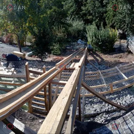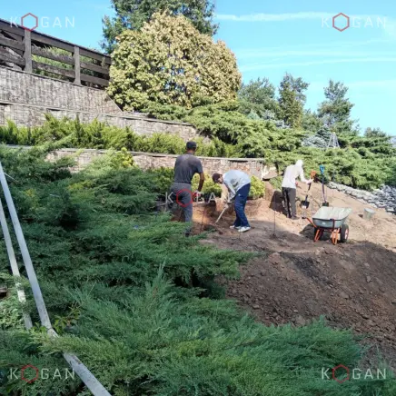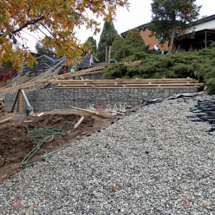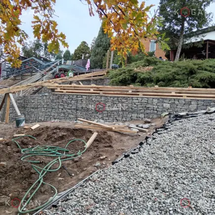 Задачей номер один стала стабилизация грунта — нужно было сделать склон безопасным и устойчивым. Специалисты занялись земляными работами, террасировали склон, установили двухступенчатую подпорную стену. Это позволило создать устойчивую основу для дальнейшего благоустройства.