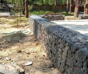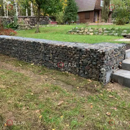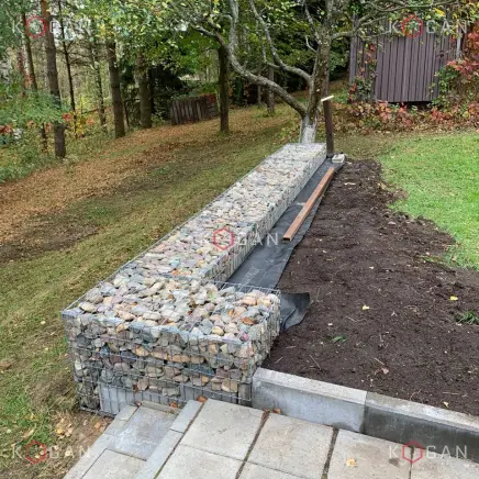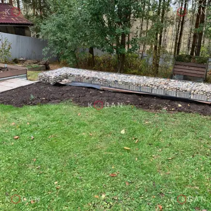 Наш заказчик из Ярославля точно относится ко второй категории. Чтобы обыграть большой перепад высот и укрепить склон, в нижней части участка он построил подпорную стенку. Для её монтажа потребовалось 12 сварных габионов 1×0,5×0,6 метра с ячейкой сетки 50×100 мм, натуральный камень и болтовые крепления. Высота стенки – один метр.
