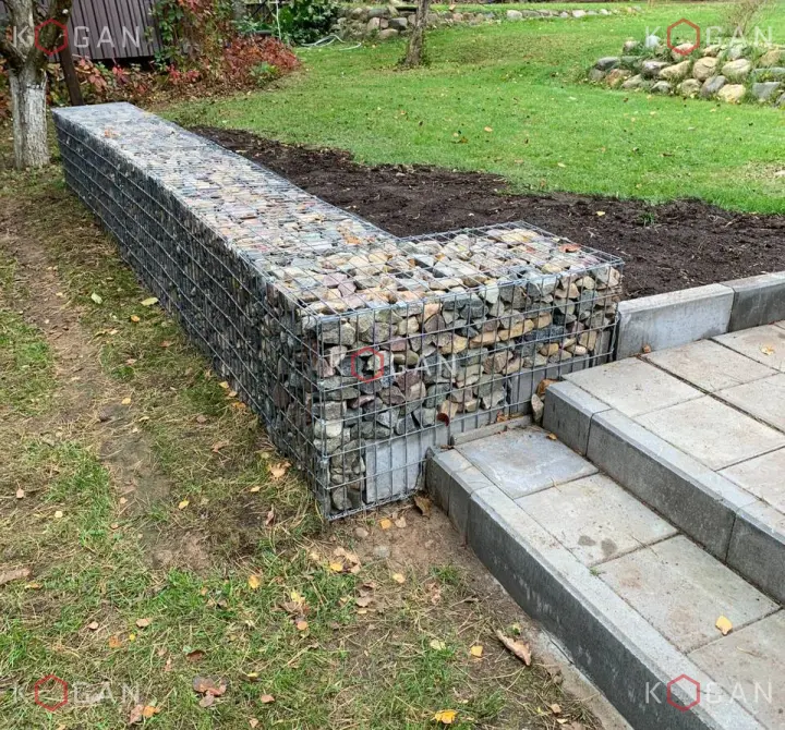 Габионная конструкция имеет Г-образную форму, что позволило оптимально вписать её в существующее пространство. К торцевой части стенки примыкает лестница из бетонных плит, которая плавно переходит в дорожку, ведущую к дому и саду. Это создало удобную связь между разными уровнями участка.