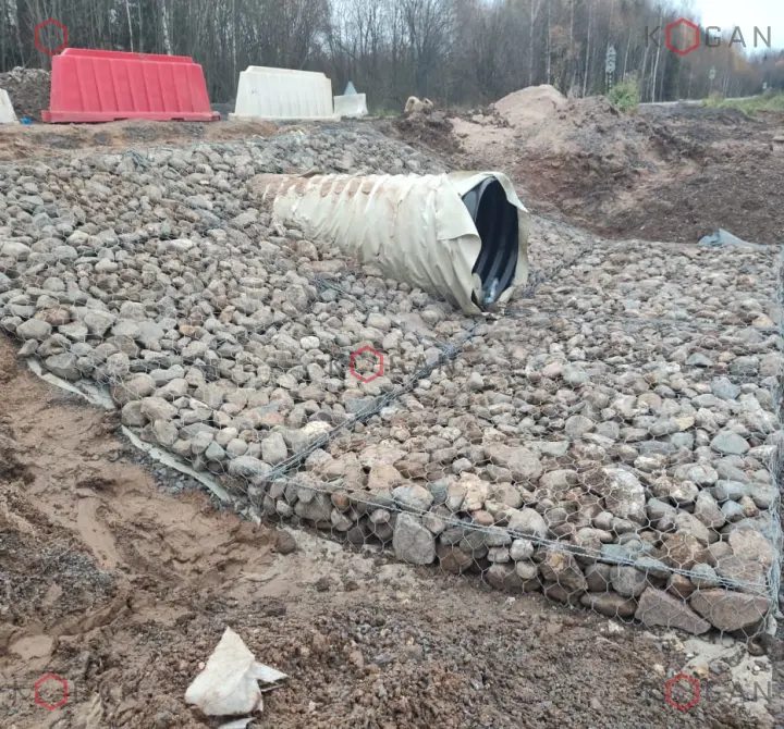 Матрацные габионы часто и успешно используются в дорожном хозяйстве для укрепления оголовков водопропускных труб и стабилизации прилегающих русел. Они эффективно предотвращают осыпание и размывание грунта, защищая входные и выходные участки от эрозии, что значительно продлевает срок службы дренажных систем.
