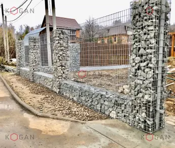 Строители собрали габионное основание забора, заполнили конструкции натуральным камнем, а поверх установили высокое дощатое ограждение.