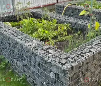 Также мы предоставили готовую для сборки квадратную клумбу. Она тоже сделана из проволоки 4 мм с ячейкой 50×100. Ширина стенки под камень – 30 см. Высота конструкции – 60 см. Предусмотрен деревянный настил. Таким образом, клумба здесь – не только для того, чтобы цветами полюбоваться, но и чтобы присесть и отдохнуть.