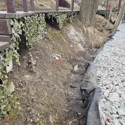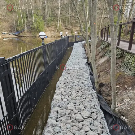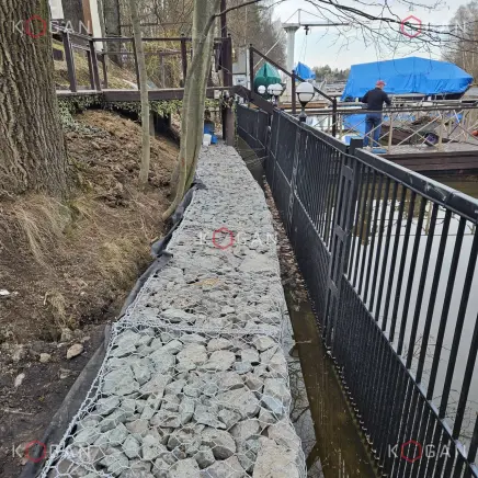 В Подмосковье наши габионы из сетки двойного кручения помогли решить проблему с аварийным берегом, создающим угрозу для инфраструктуры прибрежной зоны. Склон активно разрушался, из-за чего растущие на нём деревья начали крениться к воде, а расположенные рядом пешеходные дорожки с деревянным настилом и перилами оказались под угрозой.