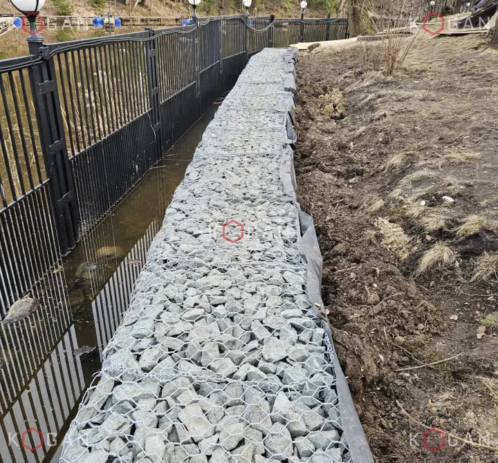 Для стабилизации ситуации наш заказчик (строительная организация) возвёл подпорную стену, применив коробчатые габионы 2×1×1 м с дополнительным полимерным покрытием оцинкованной проволоки сетки. Всего по проекту потребовался монтаж 24 таких конструкций.
