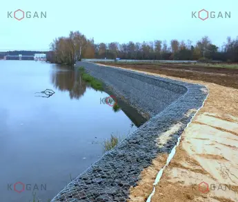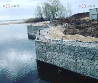 С помощью цилиндрических Габионов Коган ™ строительная бригада защитила берег от размыва и в дальнейшем установила на них подпорные стены из матрацно-тюфячных и коробчатых габионов.