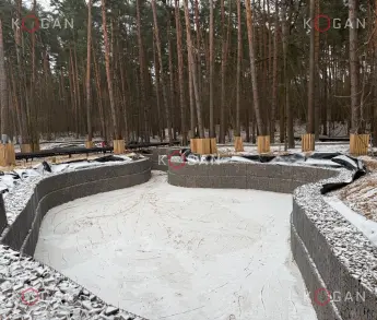 Большинство материалов, которые использованы на объекте, – российские, по большей части изготовлены в Рязанской области. Укрепление береговой линии проводилось методом погружения ПВХ-шпунтов в грунт в урез воды. Габионные конструкции уложены на берегу для защиты от размыва.