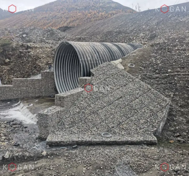 Габионы Коган применены для укрепления выходного оголовка крупной водопропускной трубы на участке федеральной автомобильной дороги «Колыма». Объект расположен в горной местности, где перепады температур, вечная мерзлота и водные потоки создают серьёзную нагрузку на инфраструктуру.