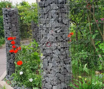 Ограждающая конструкция построена из сварных габионов нашего производства. Объект находится в частном секторе Истринского района Московской области. Металлоконструкции, «пронизывающие» тело габиона, позволят закрепить поверх сварной конструкции заборные секции из другого материала, например деревянные.