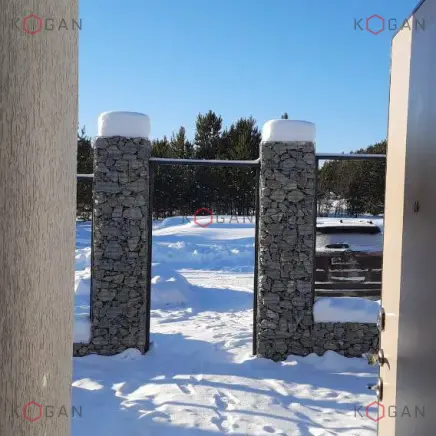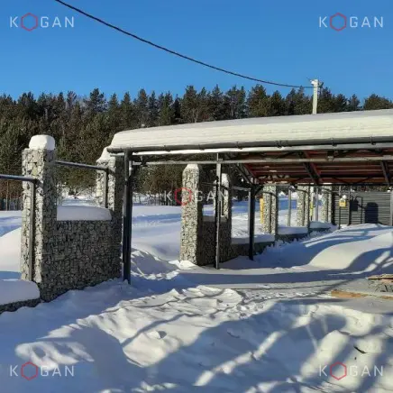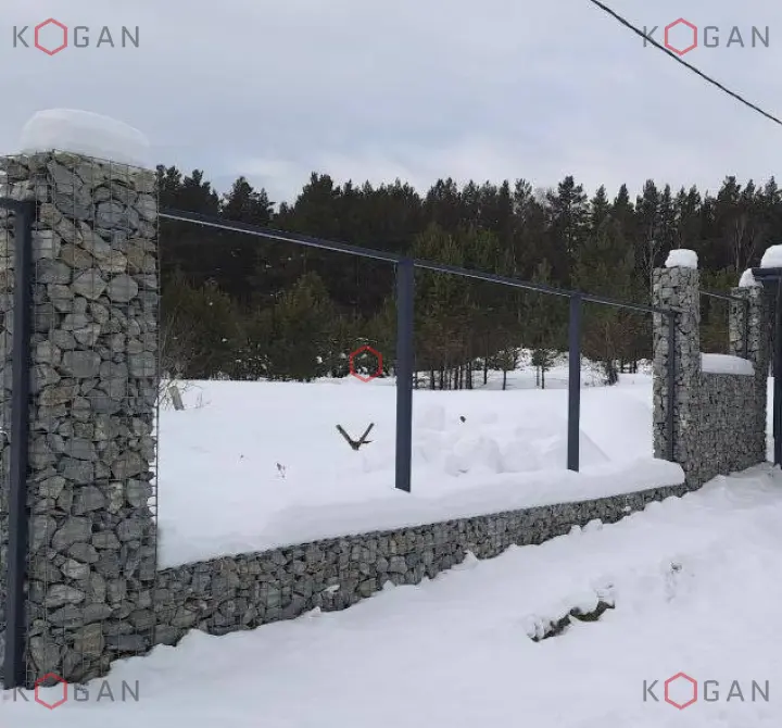 В Свердловской области продукция нашего завода применена для строительства комбинированного забора на частном участке. Заказчик выбрал решение, где габионная часть выполняет роль цоколя и столбов. Для их создания использованы сварные карты 2,5×2 метра с ячейкой 50×100 мм и диаметром проволоки сетки 4,8 мм.