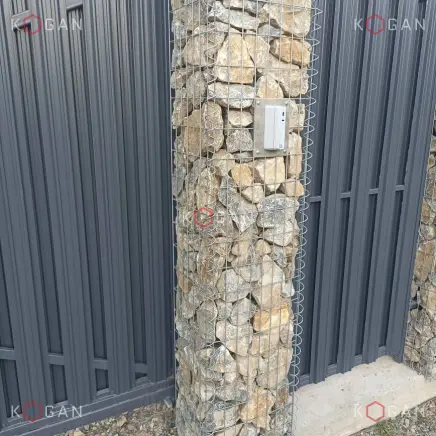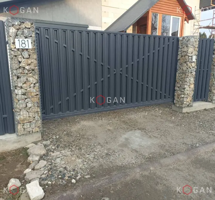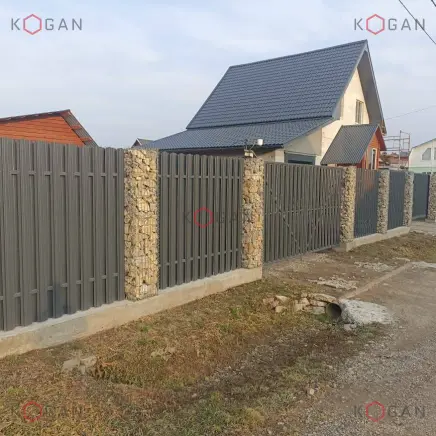 Габионные столбы «нанизаны» на жёсткий металлический каркас, который стал основой для крепления пролётов из металлокаркаса. В заборе также предусмотрены калитка и ворота.