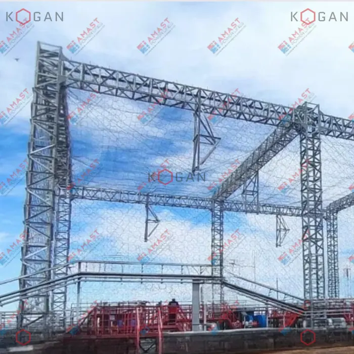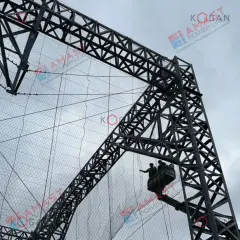 Некапитальное сооружение на системе вертикальных стоек и горизонтальных ригелей, объединённых тросовыми связями и фермами. Простая и быстрая в монтаже. Не требует наличия оттяжек. - Система защиты