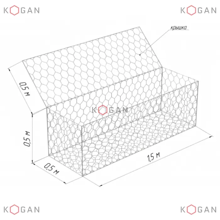 Габион коробчатый ГCИ-К-1,5х0,5х0,5-С60-2,4-Ц – прочная объемная конструкция из сетки двойного кручения для инженерной защиты территорий, изготовленная в соответствии с ГОСТ Р 52132-2003 и ТУ 25.99.13-001-52757089-2018. Габаритные размеры конструкции составляют 1,5х0,5х0,5 м с шестиугольными ячейками сетки 60х80 (С60).