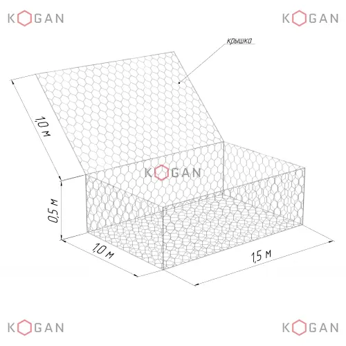 В производстве используется проволока диаметром 2.4/3.4 с защитным покрытием ЦП(ПВХ) плотностью не менее 230 г/м2 (ГОСТ Р 50575) согласно стандарту ГОСТ Р 50575, обеспечивающим надежную защиту от коррозионных процессов в агрессивных условиях эксплуатации. Для заполнения конструкции рекомендуется использовать каменный материал размером от 70-90 до 120-170.